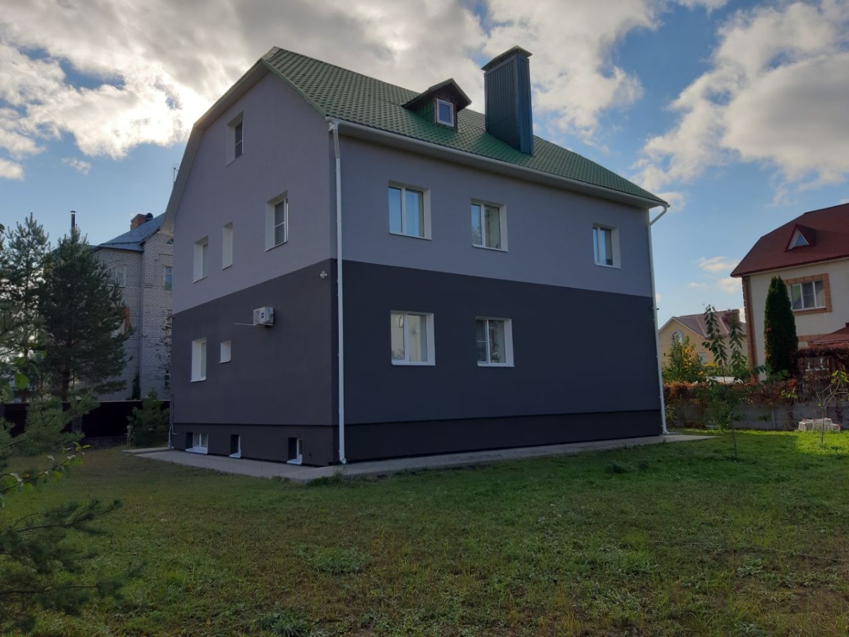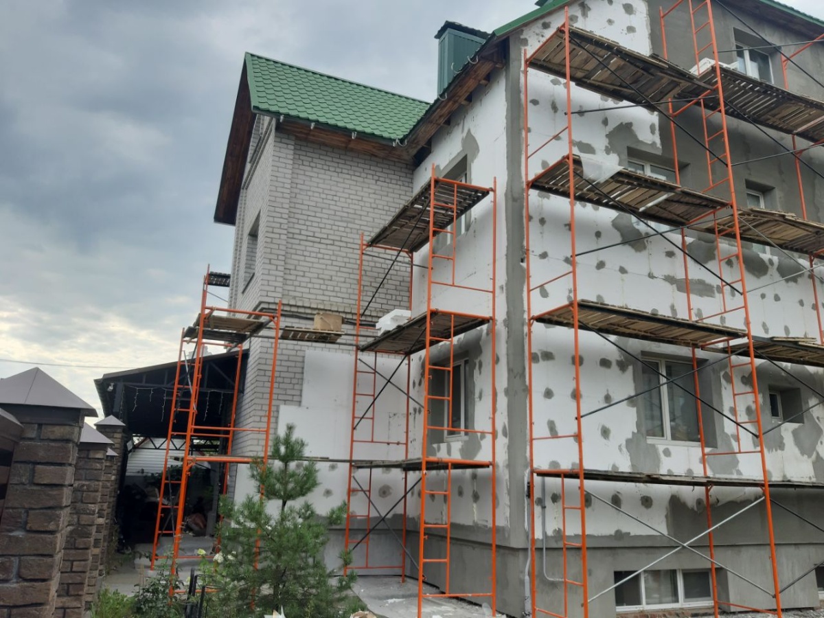 Выполняли работы: По периметру дома смонтировали стартовый профиль, на клеевой состав и тарельчатые дюбеля закрепили минераловатные плиты толщиной 50 мм, в местах оконных и дверных откосов собрали систему из ПВХ профилей, нанесли штукатурно клеевую армирующую смесь по стеклосетке производства компании Крейзель, в местах оконных и дверных проёмов сделали усиление из стеклосетки и армирующей смеси, нанесли ручным инструментом финишную декоративную штукатурку тип «Барашек» заколерованную в цвет производства компании Крейзель. Смонтировали водосточную систему, установили отливы на окна.