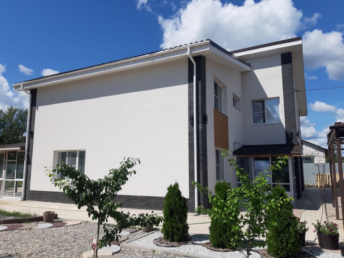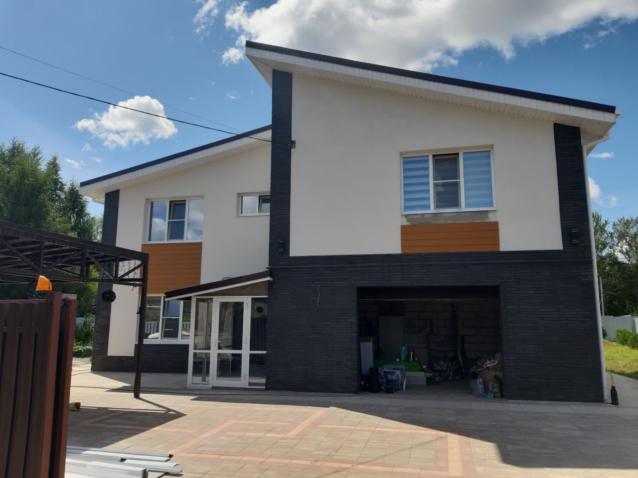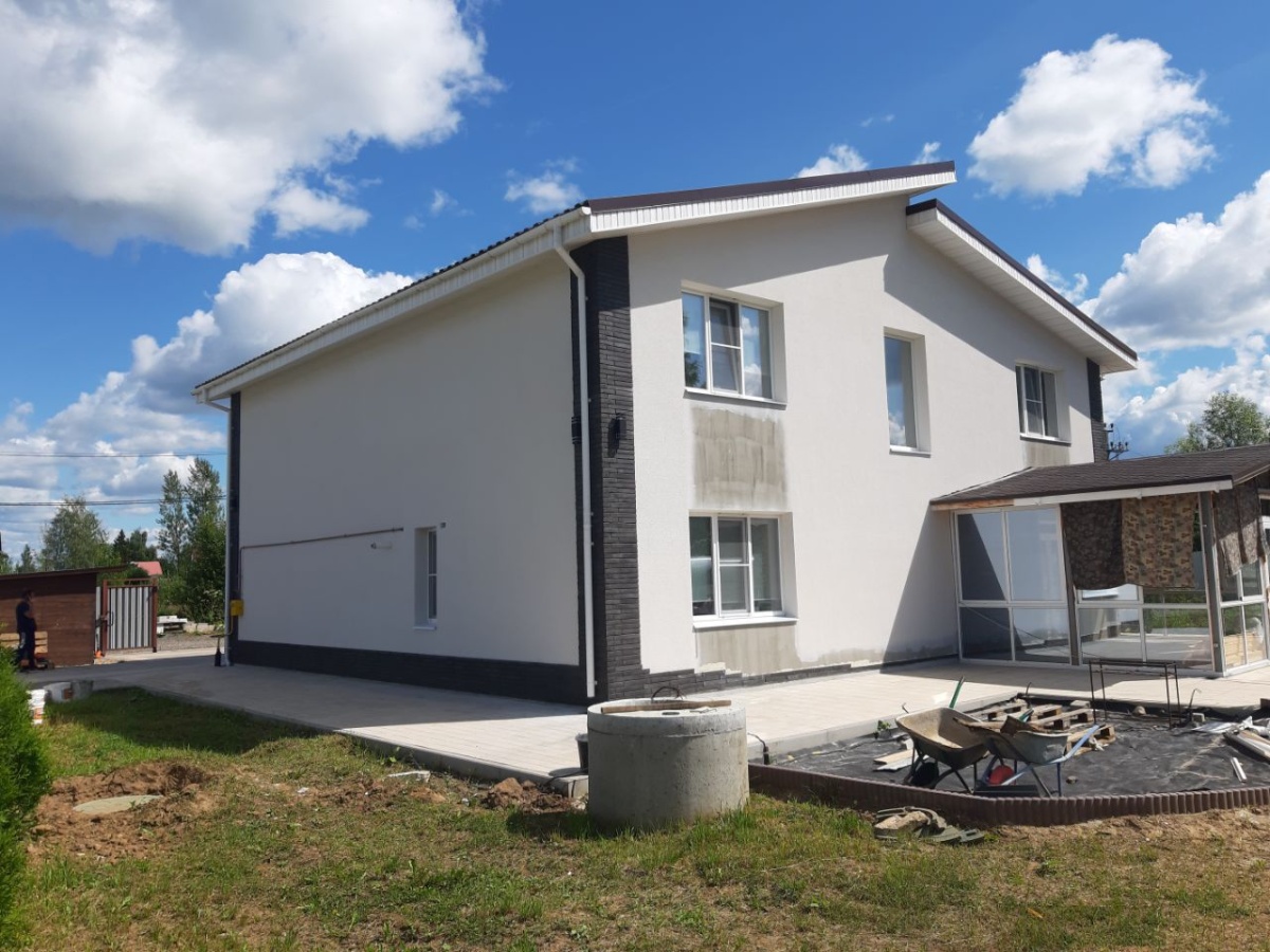 Выполняли работы: По периметру дома смонтировали стартовый профиль, на клеевой состав и тарельчатые дюбеля закрепили минераловатные плиты толщиной 50 мм, в местах оконных и дверных откосов собрали систему из ПВХ профилей, нанесли базовый армирующий слой по стеклосетке производства компании Крейзель, в местах оконных и дверных проёмов сделали усиление из стеклосетки и армирующей смеси, нанесли ручным инструментом финишную декоративную штукатурку заколерованную в цвет, приклеили фасадный декоративный камень, смонтировали фиброцементные панели, смонтировали водосточную систему.