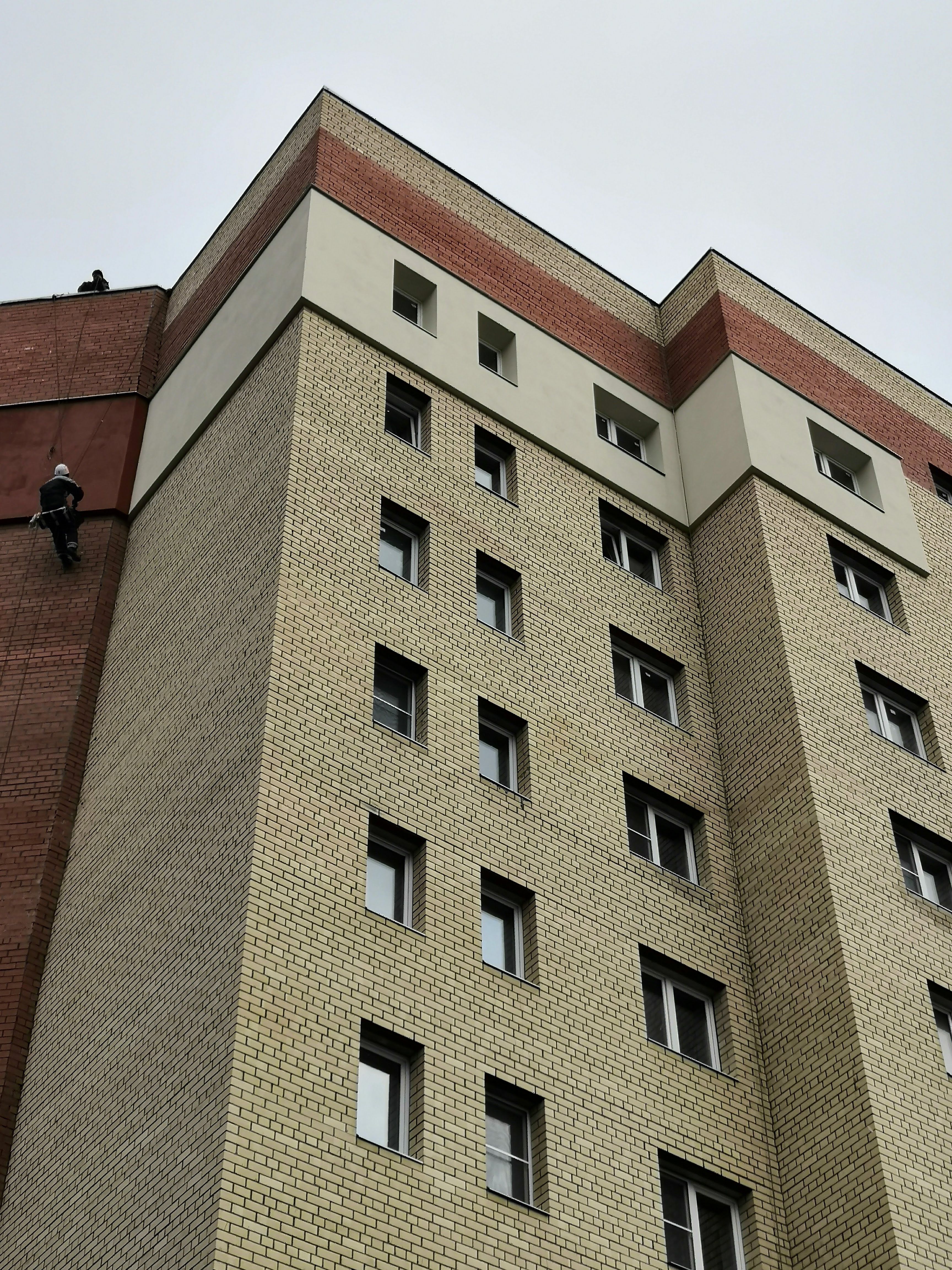 Работы производились методом промышленного альпинизма в следующей последовательности: Закрепили и спустили веревки, нанесли грунт на стены, произвели крепление утеплителя из Пенополистирола ППС толщиной 150 мм на клеевую смесь и тарельчатые дюбели к кирпичным стенам фасада, собрали на оконных проёмах подсистему и ПВХ профилей и ПВХ углов, нанесли базовый армирующий слой по стеклосетке, шпатлевка, нанесли грунт, покрасили фасадной краской в 2 слоя, установили отливы из окрашенной стали над утеплителем, на оконные проёмы.