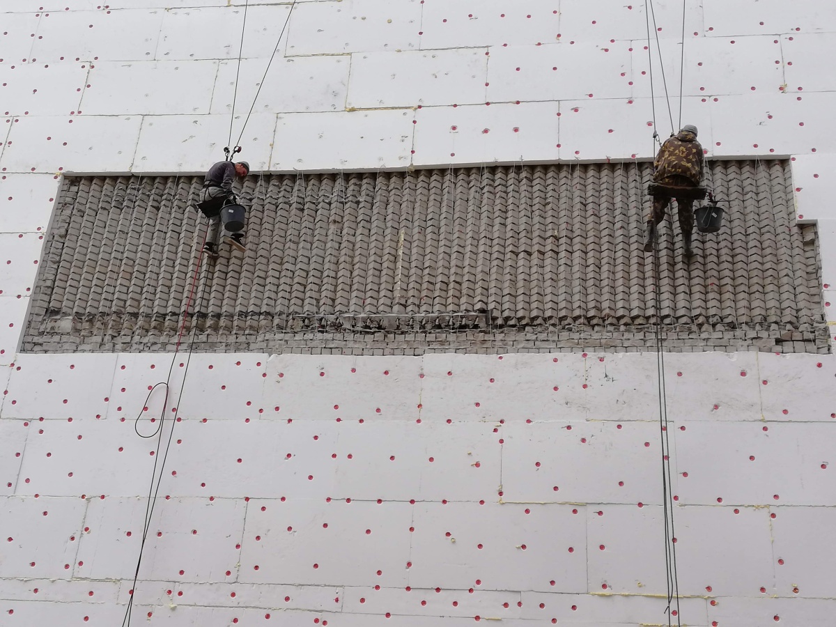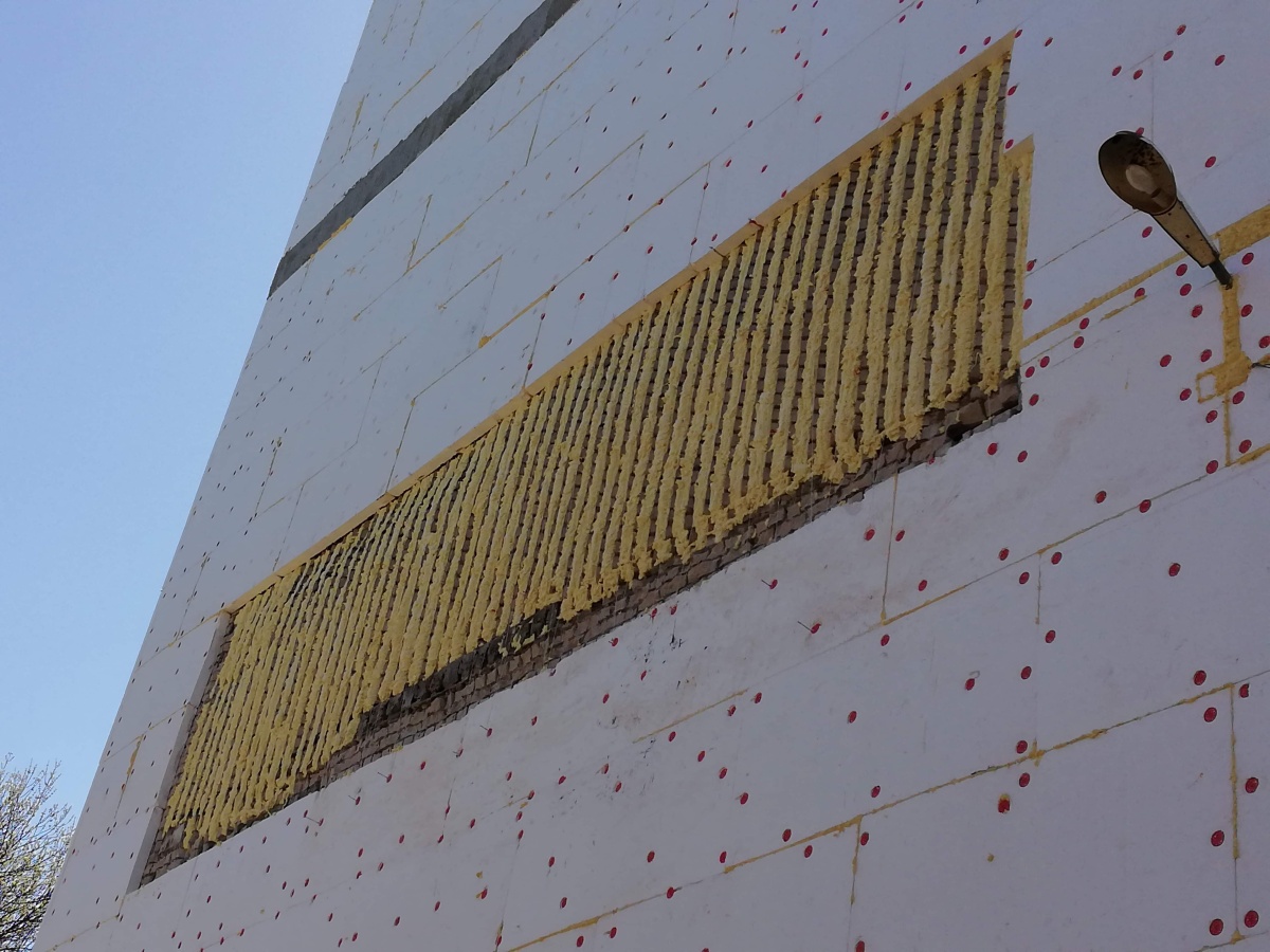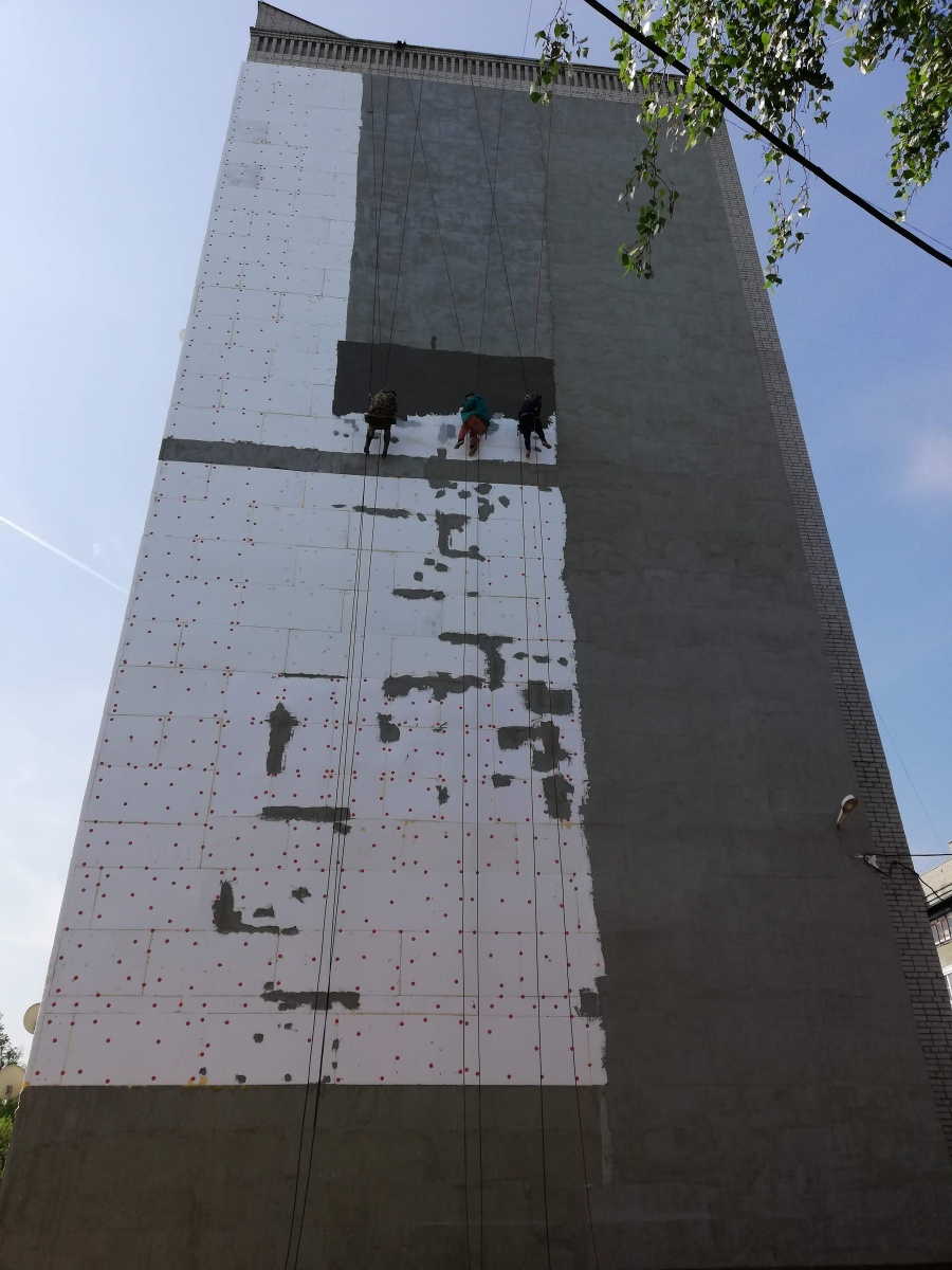 Работы производились методом промышленного альпинизма в следующей последовательности: Закрепили и спустили веревки, нанесли грунт на стены, произвели крепление утеплителя из Пенополистирола ППС толщиной 100мм на клеевую смесь и тарельчатые дюбели к кирпичным стенам фасада, нанесли базовый армирующий слой по стеклосетке, нанесли грунт, покрасили фасадной краской в 2 слоя, установили отливы над верхней частью утепления.