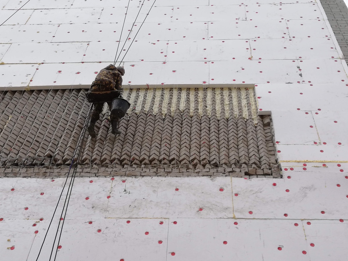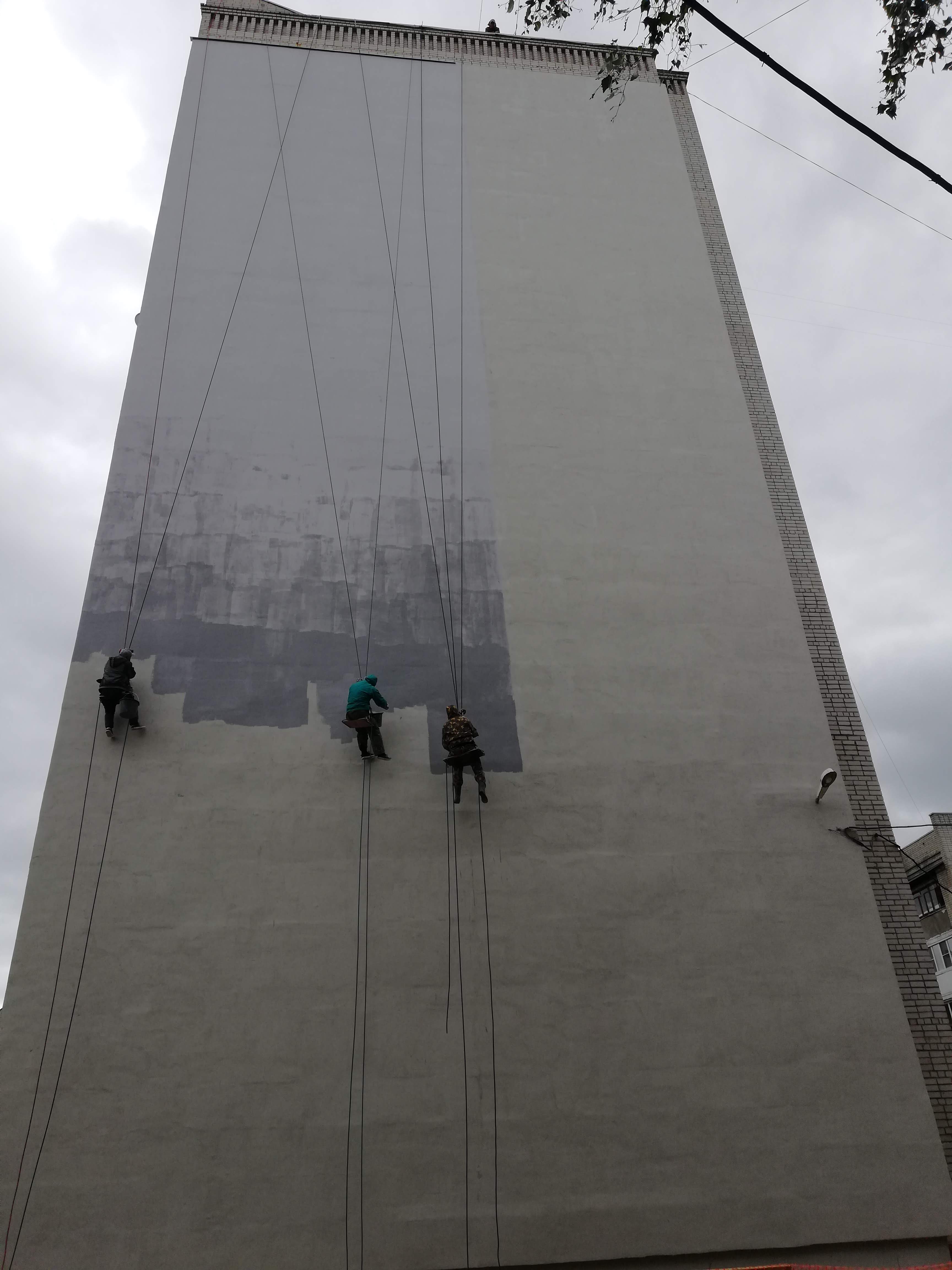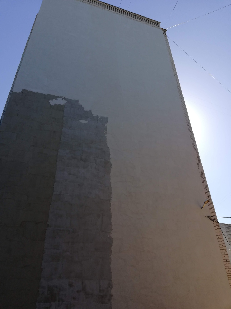 Работы производились методом промышленного альпинизма в следующей последовательности: Закрепили и спустили веревки, нанесли грунт на стены, произвели крепление утеплителя из Пенополистирола ППС толщиной 100мм на клеевую смесь и тарельчатые дюбели к кирпичным стенам фасада, нанесли базовый армирующий слой по стеклосетке, нанесли грунт, покрасили фасадной краской в 2 слоя, установили отливы над верхней частью утепления.